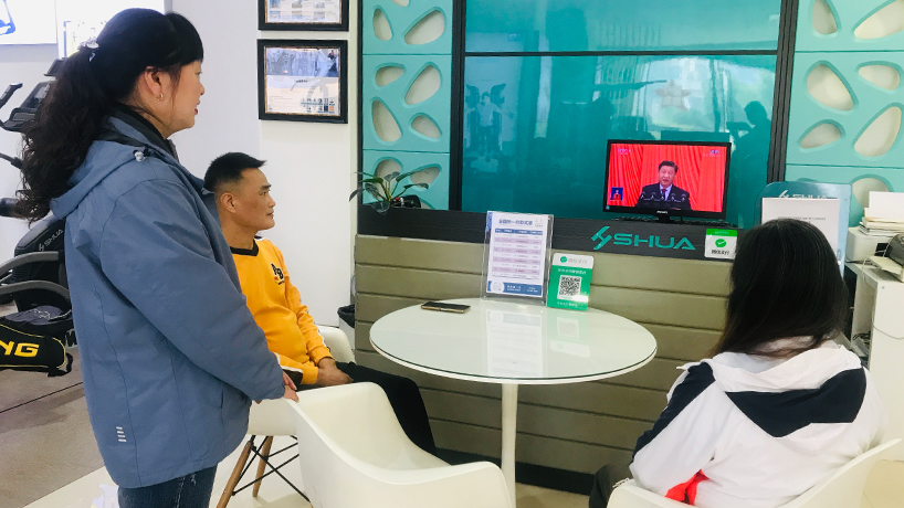 上午9時不到,友杰體育全體員工就早早會聚到會議室,友杰各直營門店的工作人員也準時打開電視,認真觀看學習二十大的會議精神。開幕會直播時,在習近平總書記近2小時的報告過程中,會議現(xiàn)場不時自發(fā)響起熱烈的掌聲。